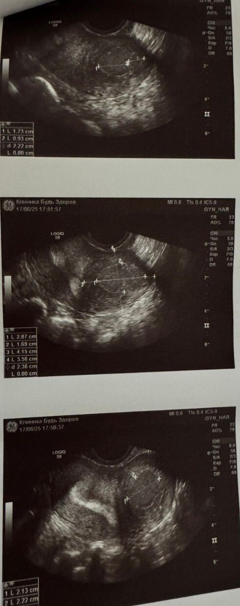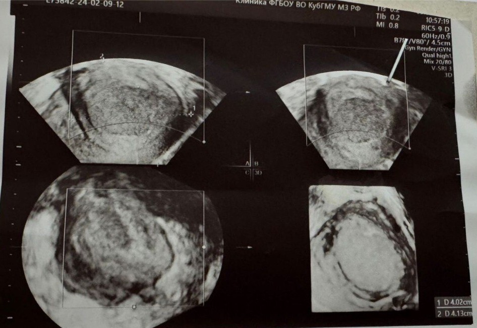 В 2023 году на профилактическом осмотре врач выявил кисту матки (жидкостное образование 40х50 мм. с толстыми стенками). Она находилась в верхней части матки, ближе к левому маточному углу в её мышечном слое. Врачи поликлиники рекомендовали наблюдение, и ориентировали пациентку что образование самостоятельно пройдёт после родов.